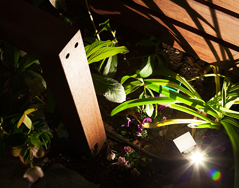 ウリンという腐食することのない木材を使用。石と木の組み合わせが建物とマッチしモダンな雰囲気を演出します。