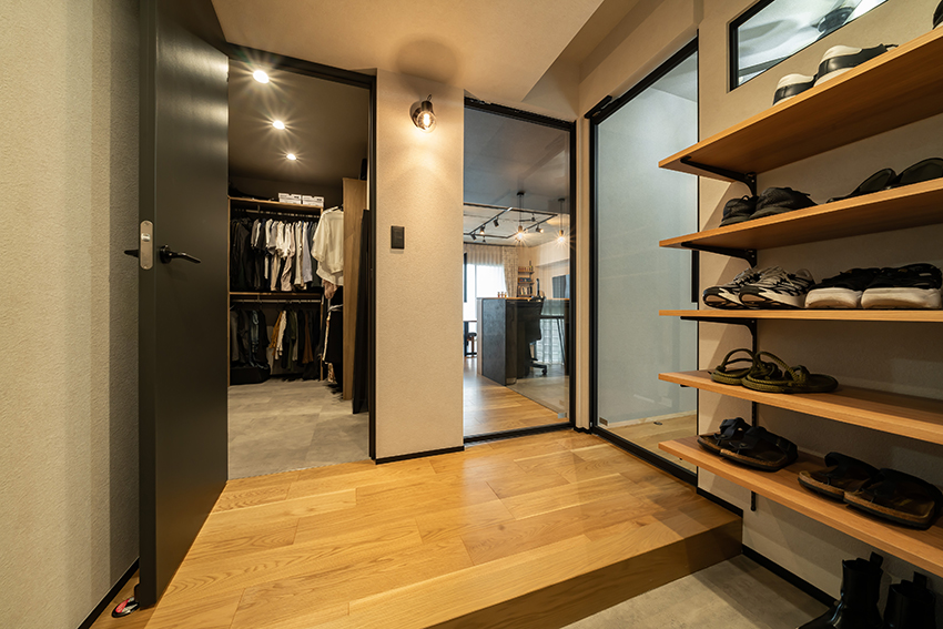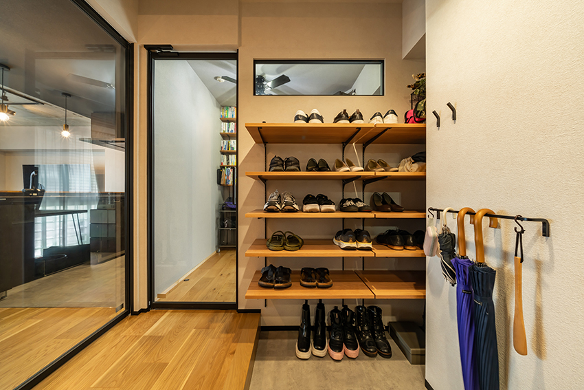 LDKと書斎の入口、そして書斎の室内窓がガラスであることで自然光が玄関まで届き、暗くなりがちなマンションの玄関を明るく開放的な印象に仕上がりました。