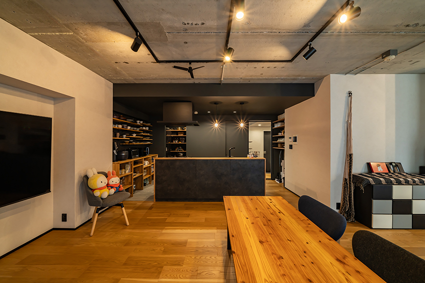 躯体あらわしのコンクリート天井、木目の濃淡が豊かなオークの床材、建具や金具類はブラックで統一。