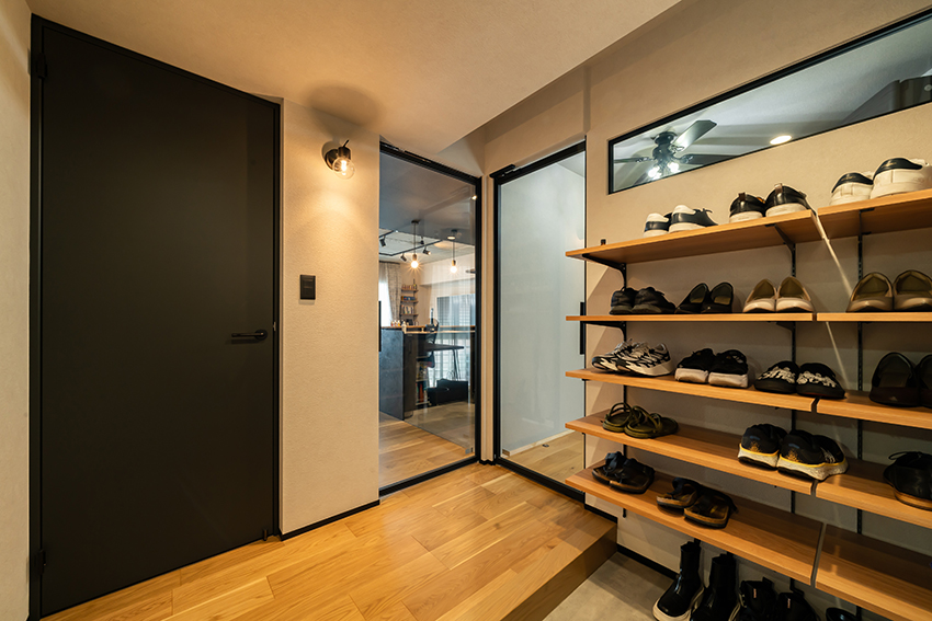 LDKと書斎の入口、そして書斎の室内窓がガラスであることで自然光が玄関まで届き、暗くなりがちなマンションの玄関を明るく開放的な印象に仕上がりました。