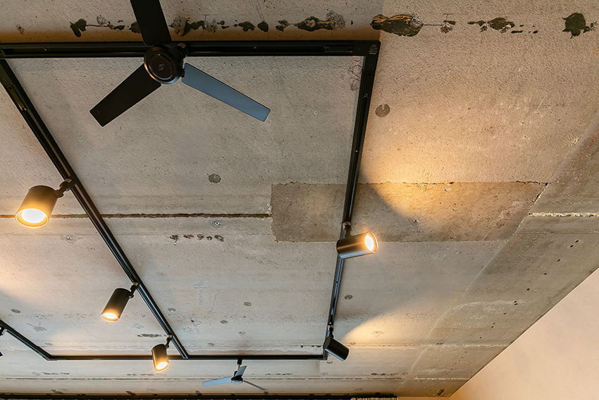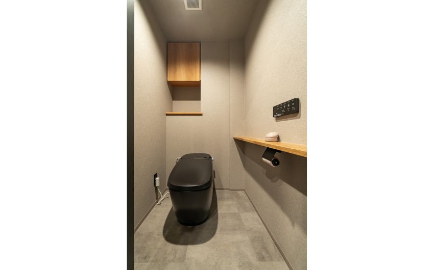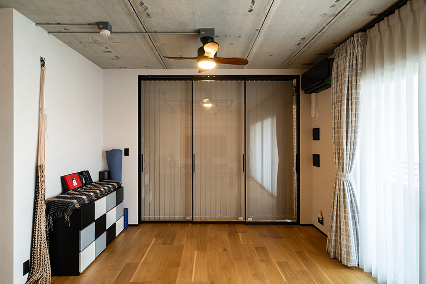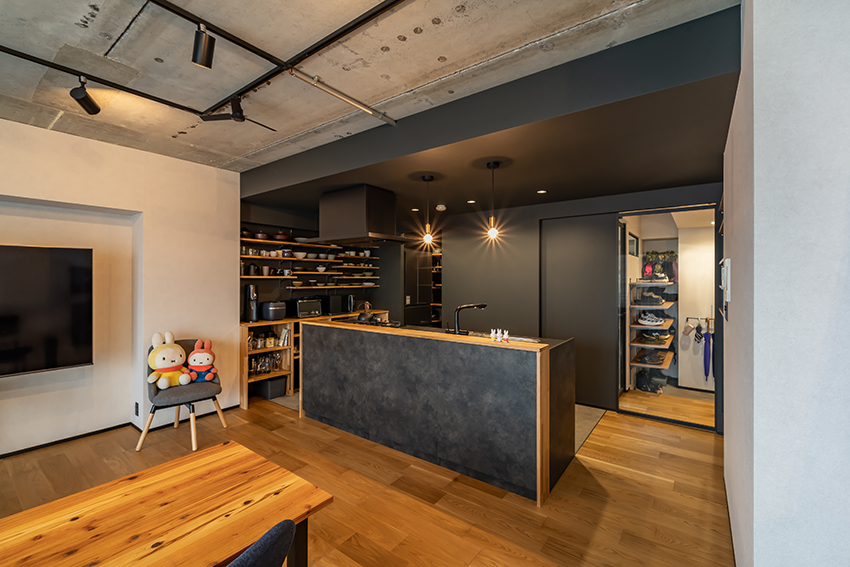 躯体あらわしのコンクリート天井、木目の濃淡が豊かなオークの床材、建具や金具類はブラックで統一。