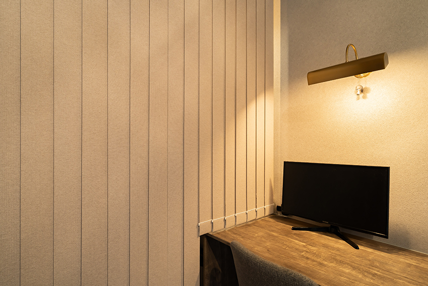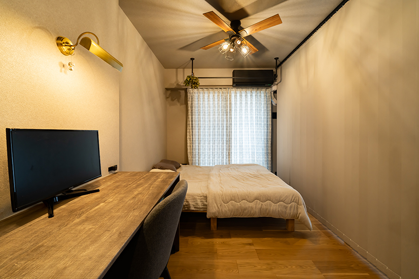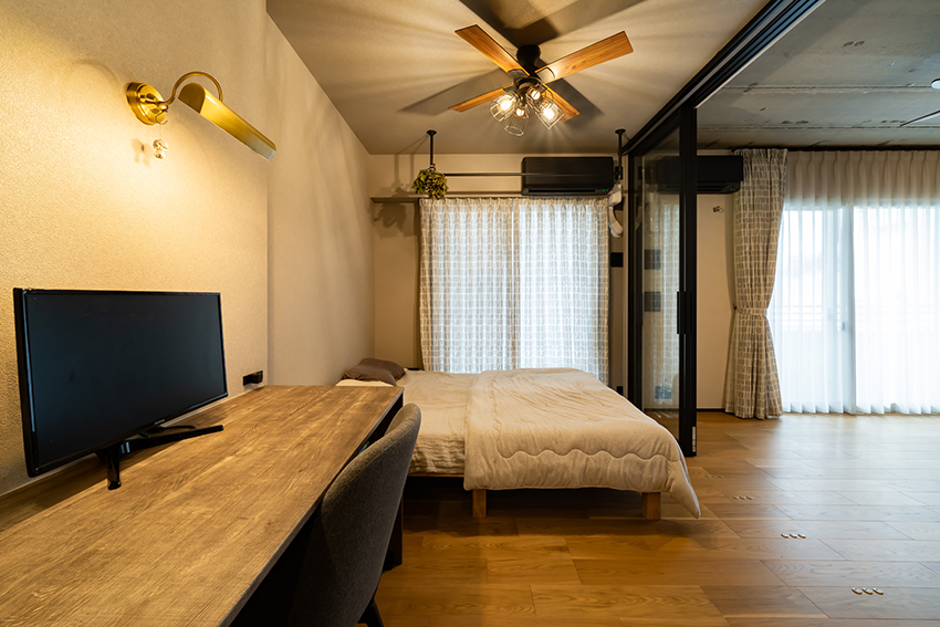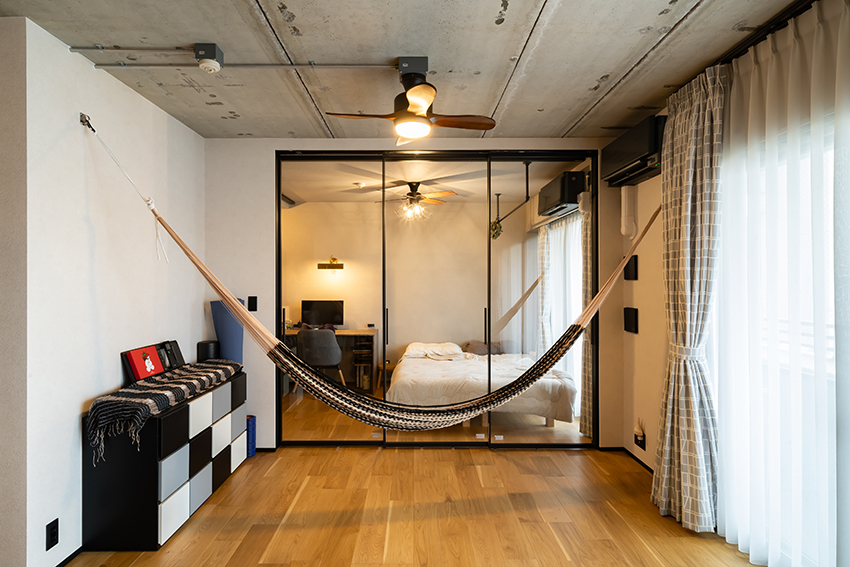 改装前の壁やドアでの仕切りを減らし、アルミガラス建具やカーテン類でゆるやかに仕切ることで、隣接する玄関や寝室への視線が抜ける広がりのある間取りに。