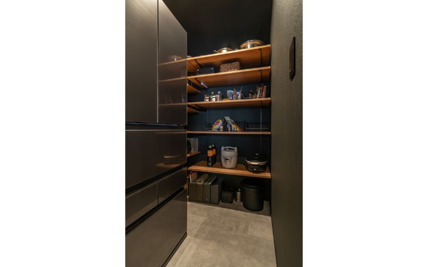 真四角な間取りの中心に“収納のハコ”を作ることで、空間を無駄なく使えるようにしました。 LDKはアルミガラス建具でゆるく仕切ることで空間の広がりを出しながらも、キッチン裏のパントリーやウォークスルークローゼットに収納をまとめることで、生活感を抑えつつ、動線の使いやすさも確保しています。