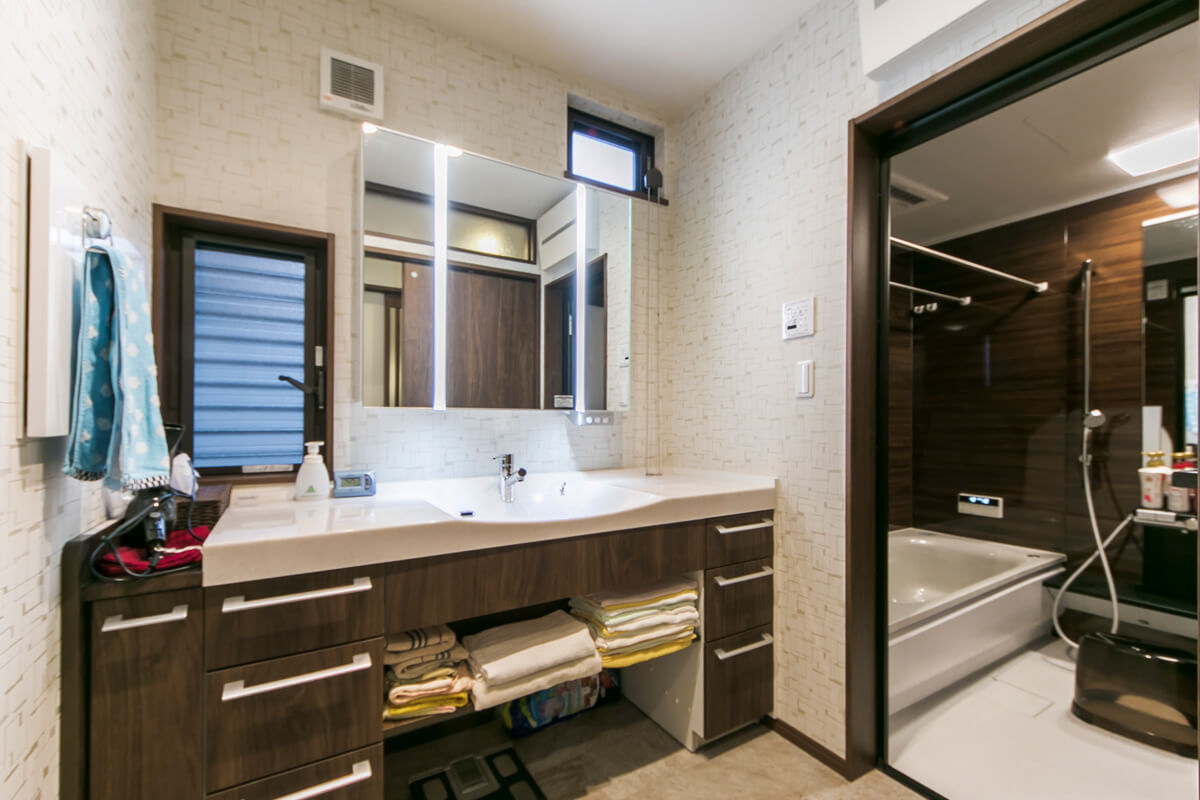 壁などを全て解体してのスケルトンリフォーム。キッチンなど、水回りの配置から外回り、ベランダ部分など暮らし方に合わせてリノベーション。 キッチンは以前は壁向きのI型でしたが対面式に。油跳ねや圧迫などを考慮し透明の袖壁にしいました。 玄関はオープンのシューズクロークを造作。扉がない分省コストで収納もスムーズ。 廊下には大型の収納を設計。掃除機などのスペースもきちんと確保。食材などのストックにも便利です。 ベランダ部分は元々部屋だった部分を屋根付きのオープンデッキに。天気が良ければここちい風を感じながら食事なども楽しめます。 ご主人専用の書斎もつくり、家族みんなが快適な住まいになりました。