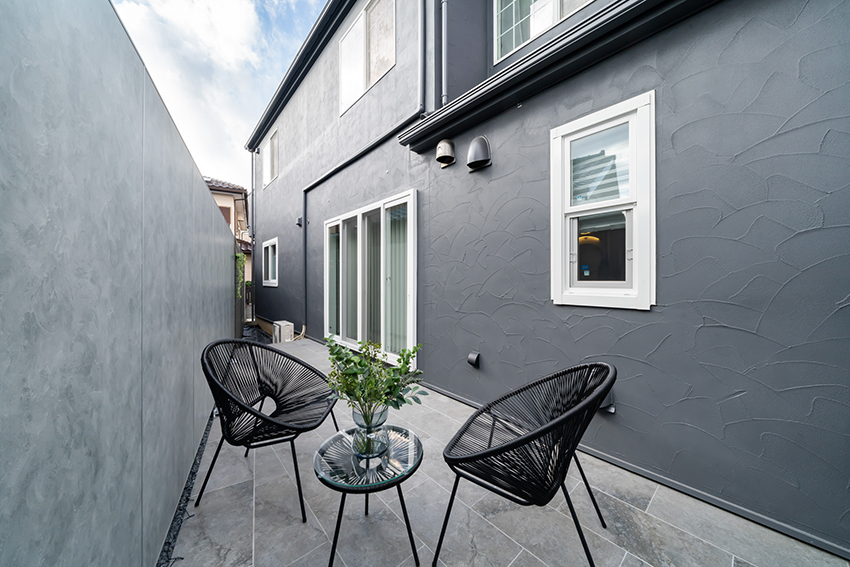 隣家との距離が近く、リフォーム前はカーテンを閉めてでの生活でしたが、今回のリフォームで外回りのテラスと塀を弊社ランドガーデンが施工。