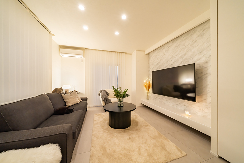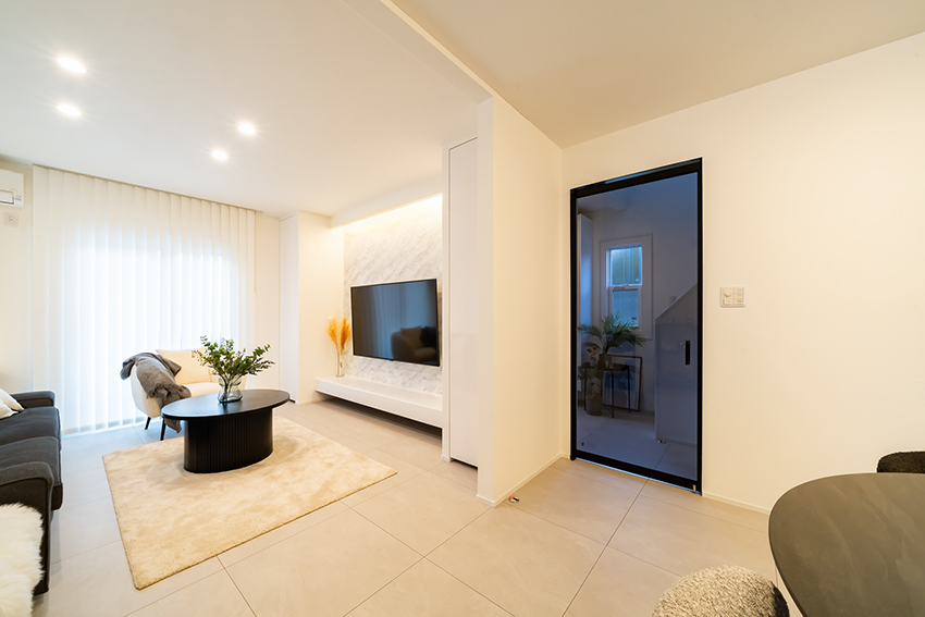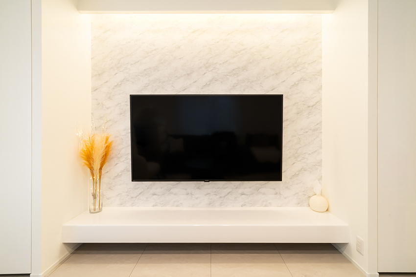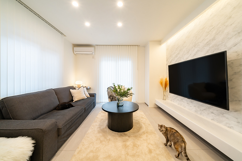 スッキリとしたTVボードと背面の石目柄シート、左右に配置した収納は存在感を出さず、洗練されたリビング空間に仕上がりました。