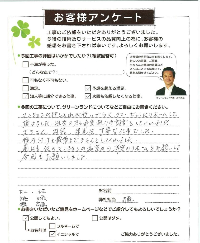 マンションの押し入れが使いづらく、クローゼットにリフォームしに頂きました、担当の方も希望通りの設計をしてくれました。 大工さん、内装、建具共丁寧な仕事でした。 後片付けも最後まできちんとしてくれました。 前にも他のマンションの和室から洋室のリフォームをお願いして今回もお願いしました。