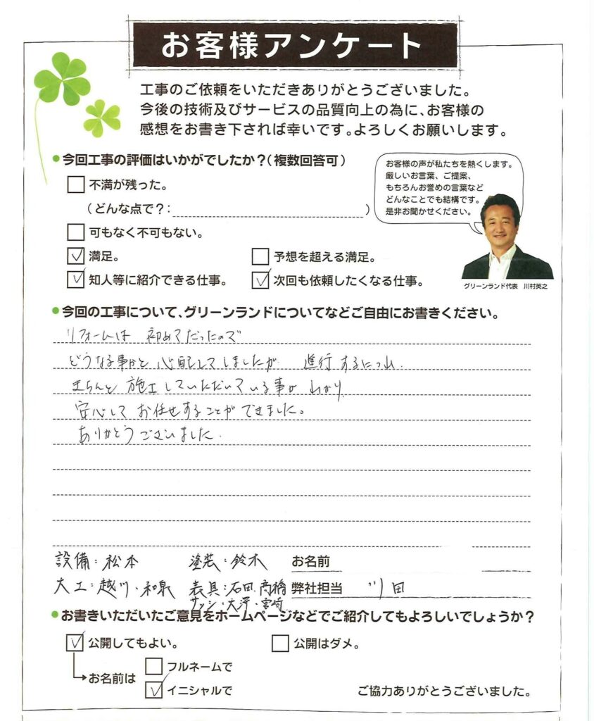 担当の方はこちら側の意向も汲んでいただき、補助金の事などいろいろご相談にのってもらいました。現場監督の方や担当の方も毎日、現場に来ていて、 職人さんたちもみなさんかんじがよかったです。 無事に工事が終わり、仕上りに満足しています。 ありがとうございました。