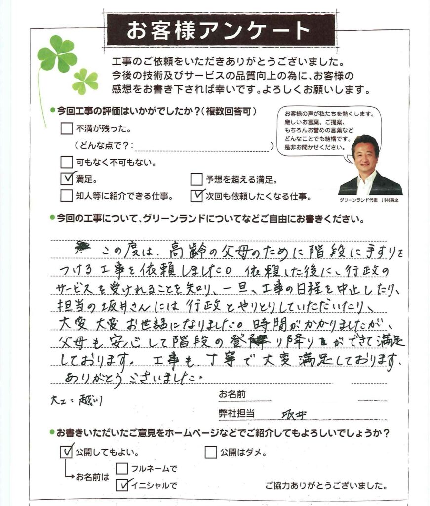この度は、高齢の父母のために階段に手すりをつける工事を依頼しました。依頼した後に、行政のサービスを受けれることを知り、一旦、工事の日程を中止したり、 担当の坂井さんには行政とやりとりしていただいたり、 大変大変お世話になりました。時間がかかりましたが、 父母も安心して階段の登り降り査ができて満足しております。工事も丁寧で大変満足しております。 ありがとうございました。