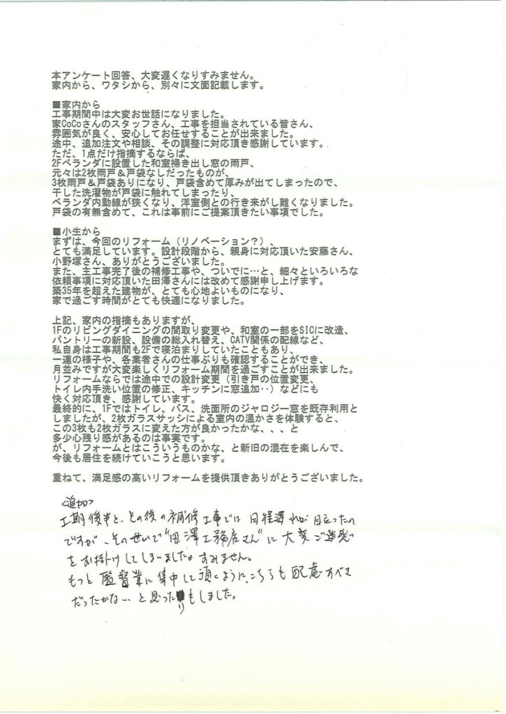 ◾️家内から工事期間中は大変お世話になりました。 家CoCoさんのスタッフさん、工事を担当されている皆さん、 雰囲気が良く、安心してお任せすることが出来ました。 途中、追加注文や相談、その調整に対応頂き感謝しています。。 ただ、1点だけ指摘するならば、 2Fベランダに設置した和室掃き出し窓の雨戸、 元々は2枚雨戸&戸袋なしだったものが、 3枚雨戸&戸袋ありになり、戸袋含めて厚みが出てしまったので、 干した洗濯物が戸袋に触れてしまったり、 ベランダ内動線が狭くなり、洋室側との行き来がし難くなりました。 戸袋の有無含めて、これは事前にご提案頂きたい事項でした。◾️小生からまずは、今回のリフォーム(リノベーション?) とても満足しています。設計段階から、親身に対応頂いた安藤さん、 小野塚さん、ありがとうございました。 また、主工事完了後の補修工事や、ついでに・・・と、細々といろいろな 依頼事項に対応頂いた田澤さんには改めて感謝申し上げます。 築35年を超えた建物が、とても心地よいものになり、 家で過ごす時間がとても快適になりました。上記、家内の指摘もありますが、 1Fのリビングダイニングの間取り変更や、和室の一部をSICに改造、 パントリーの新設、設備の総入れ替え、CATV関係の配線など、 私自身は工事期間も2Fで寝泊まりしていたこともあり、 一連の様子や、各業者さんの仕事ぶりも確認することができ、 月並みですが大変楽しくリフォーム期間を過ごすことが出来ました。 リフォームならでは途中での設計変更(引き戸の位置変更、 トイレ内手洗い位置の修正、キッチンに窓追加・・)などにも 快く対応頂き、感謝しています。 最終的に、1Fではトイレ、バス、洗面所のジャロジー窓を既存利用と しましたが、2枚ガラスサッシによる室内の温かさを体験すると、 この3枚も2枚ガラスに変えた方が良かったかな、、、と 多少心残り感があるのは事実です。が、リフォームとはこういうものかな、と新旧の混在を楽しんで、 今後も居住を続けていこうと思います。重ねて、満足感の高いリフォームを提供頂きありがとうございました。<追加>工期後半と、その後の補修工事では日程遅れが目立ったのですが、そのせいで田澤工務店さんに大変ご迷惑をお掛けしてしまいました。すみません。監督業に集中して頂くように、もっとこちらも配慮すべきだったかな……と思ったりもしました。