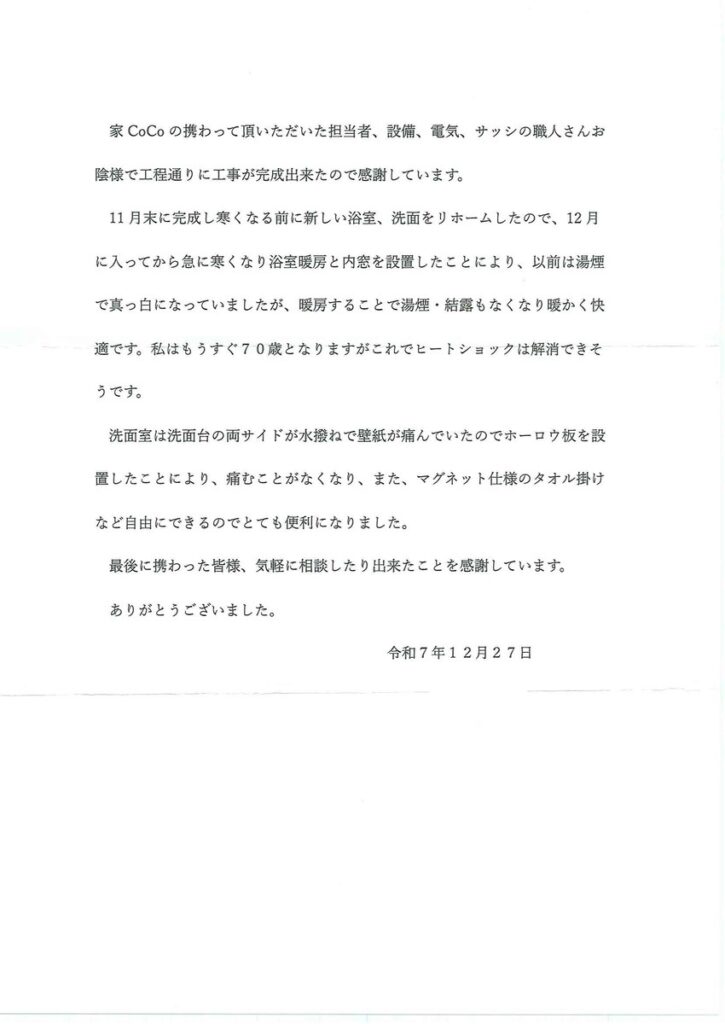 家CoCoの携わって頂いただいた担当者、設備、電気、サッシの職人さんお 陰様で工程通りに工事が完成出来たので感謝しています。11月末に完成し寒くなる前に新しい浴室、洗面をリホームしたので、12月 に入ってから急に寒くなり浴室暖房と内窓を設置したことにより、以前は湯煙 で真っ白になっていましたが、暖房することで湯煙・結露もなくなり暖かく快 適です。私はもうすぐ70歳となりますがこれでヒートショックは解消できそ うです。洗面室は洗面台の両サイドが水撥ねで壁紙が痛んでいたのでホーロウ板を設 置したことにより、痛むことがなくなり、また、マグネット仕様のタオル掛け など自由にできるのでとても便利になりました。最後に携わった皆様、気軽に相談したり出来たことを感謝しています。ありがとうございました。