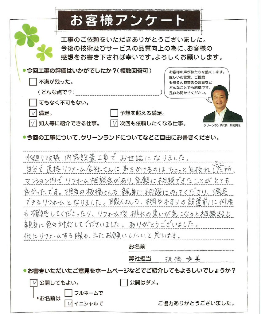 水廻り改装、内窓設置工事でお世話になりました。 自分で直接リフォーム会社さんに声をかけるのはちょっと気後れした所、 マンション内でリフォーム相談会があり、気軽に相談できたことがとても 良かったです。担当の板橋さんも親身に相談にのってくださり、満足 できるリフォームとなりました。職人さんも、棚や手すりの設置前前に何度 も確認してくださったり、リフォーム後排水の臭いが気になると相談すると 親身に色々対応してくださいました。ありがとうございました。 他にリフォームする際も、またお願いしたいと思います。