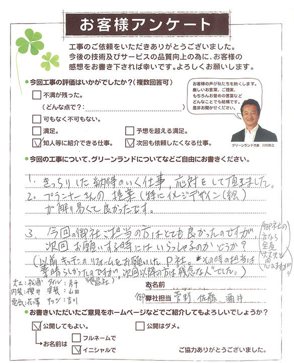 次の改装も貴社にお願いしたいので、末永く会社が繁栄することを願っております。