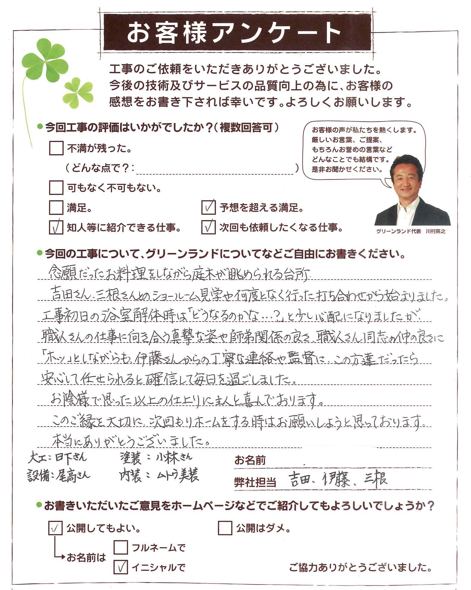 リフォームにかかわる業者さん達も皆さん気持ちのよい挨拶と対応、納得できる仕事ぶりでした。また、毎日の片付けや掃除もしっかりと行ってくれましたので感心いたしました。(笑顔ですごせました。)