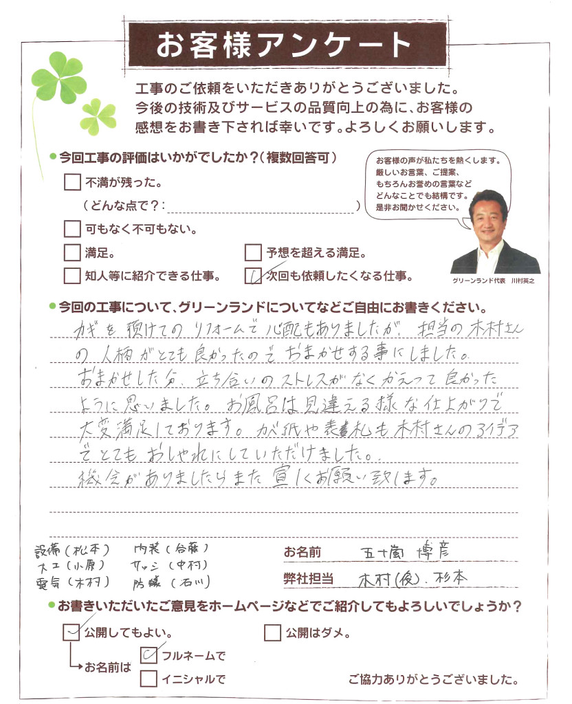 出来上がりはまるで新築住宅のような仕上がりでとても満足しています。