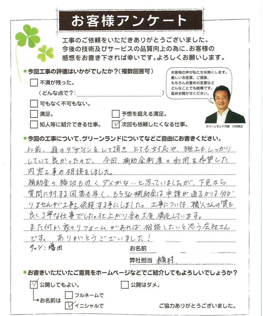以前、庭のデザインをして頂きとても対応や、施工もしっかりしていて良かったので、今回、補助金制度の利用を希望した内窓工事の相談をしました。 補助金の締切も近くダメかな・・・と思っていましたが、下見なら質問に対する回答も早く、もちろん補助金は申請が通るかは分かりませんが工事を依頼する事にしました。工事についても、職人さんの質も良く丁寧な仕事でした。仕上がり含め大変満足しています。 また何か家のリフォームがあれば、相談したいと思う会社さんです。ありがとうございました!