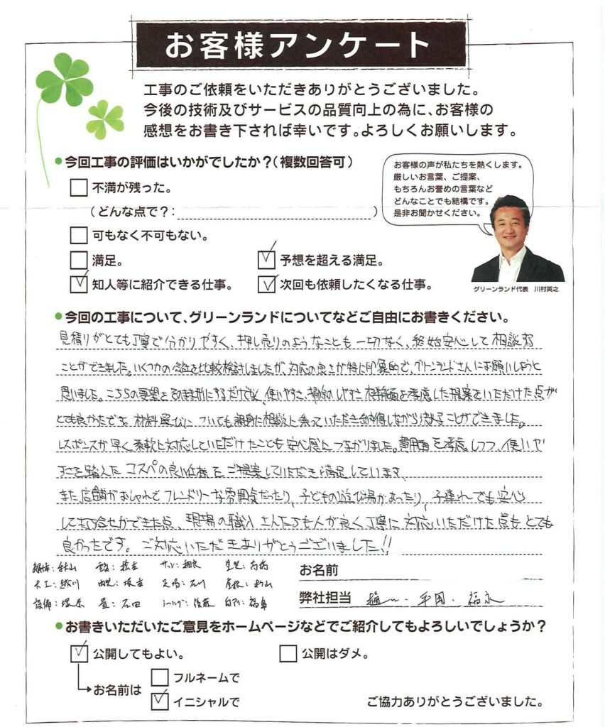 見積りがとても丁寧で分かりやすく、押し売りのようなことも一切なく、終始安心して相談することができました。いくつかの会社を比較検討しましたが、対応の良さが特に印象的で、グリーンランドさんにお願いしようと思いました。こちらの要望をそのままにするだけでなく、使いやすさ、掃除のしやすさ面を季慮した提案をいただけた点がとても良かったです。材料屋公についても親身に相談に乗っていただき納得しながら決めることができましたがレスポンスが早く、柔軟に対応していただけたことも安心感につながりました。費用を考慮しつつ、使いですこを踏えたコスパの良低様をご提案していただき満足していまでまた、店舗がおしゃれでフレンドリーな雰囲気だったり、子どものからび場があったり、子連れでも安心しに打合せ力できた点、現場の職入さんたさも人が良く丁寧に対応いただけた点もとても良かったです。ご対応いただきありがとうございました!!