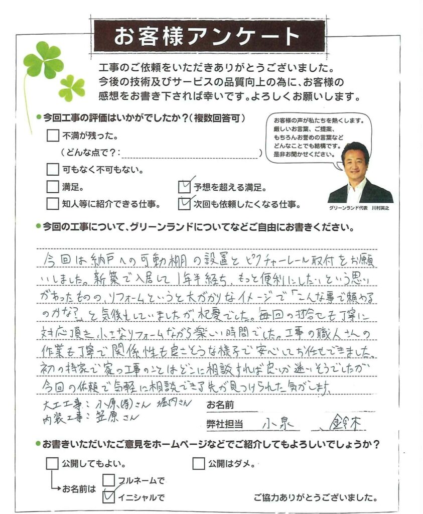 今回は納戸への可動棚の設置とピクチャーレール取付をお願いしました。新築で入居して1年半経ち、もっと便利にしたいという思いがあったものの、リフォームというと大がかりなイメージで「こんな事で頼やるのかな?」と気後れしていましたが、杞憂でした。毎回の打合せも丁寧に対応頂き小さなリフォームながら楽しい時間でした。工事の職人さんの作業も丁寧で関係性も良さそうな様子で安心してお任せできました。 初の持家で家の工事のことはどこに相談すれば良いか迷いそうでしたが今回の依頼で気軽に相談できる先が見つけられた気がします。