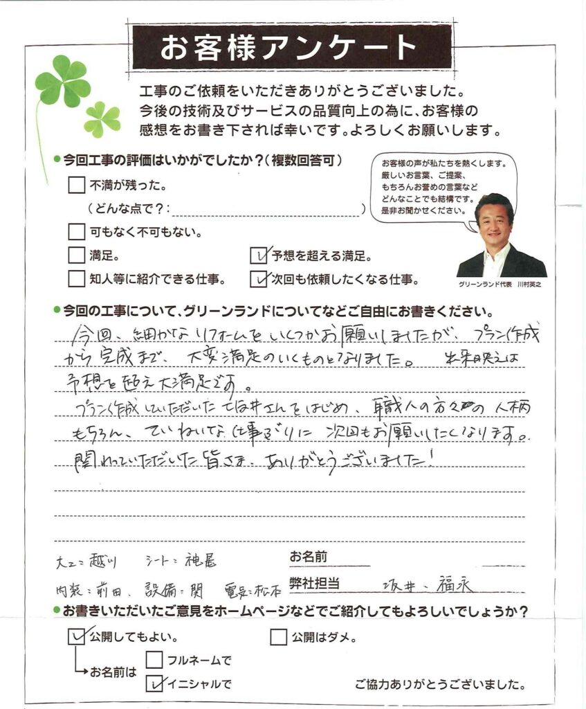 今回、細かなリフォームをいくつかお願いしましたが、プラン作成から完成まで、大変満足のいくものとなりました。出来映えは予想を超え大満足です。 プランく作成していただいたて坂井さんをはじめ、職人の方々の人柄もちろん、ていねいな仕事ぶりに次回もお願いしたくなります。 関わっていただいた皆さま、ありがとうございました!