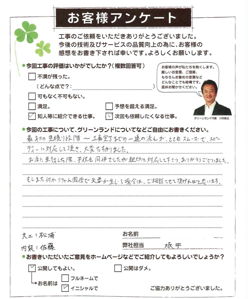 最初の見積り段階〜工事完了までの一連の流れが、とてもスムーズで、スピーディーに対応して頂き、大変たすかりました。 お店に来訪した際、子供も同伴でしたが親切に対応して下さり、ありがとうございました。もしまた何かリフォーム関係で必要が生じる場合は、ご相談させて頂ければと思います。