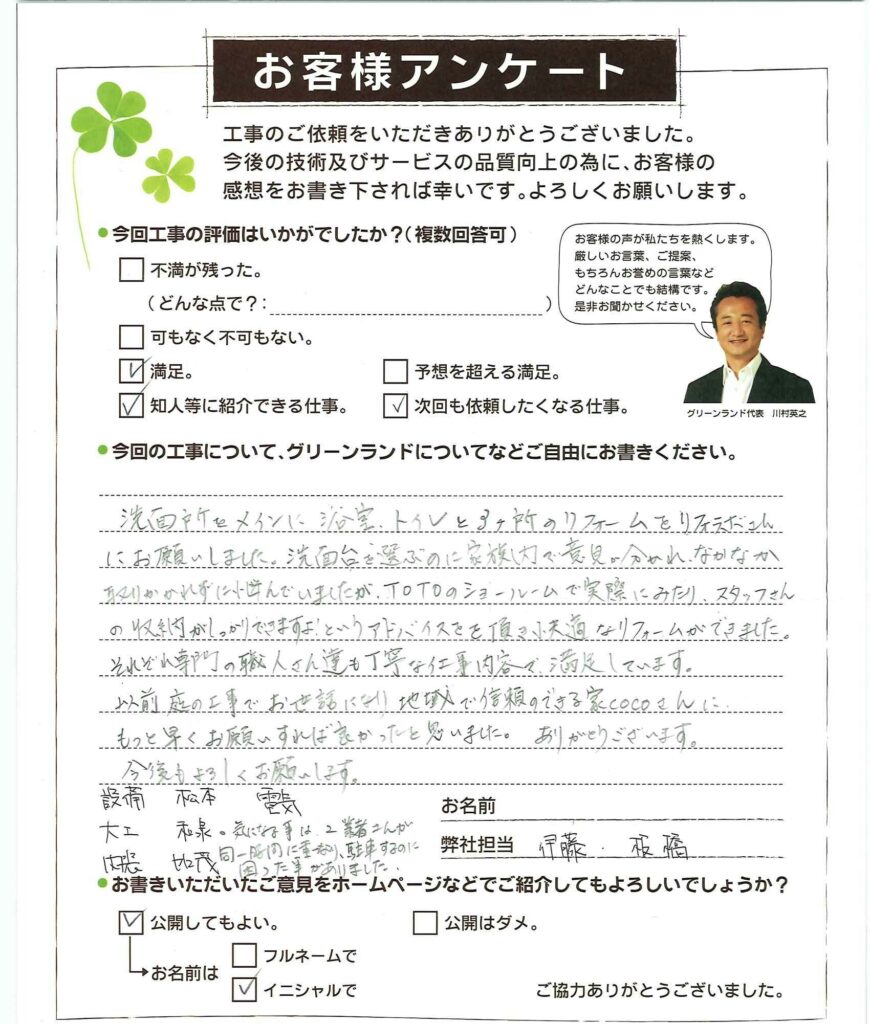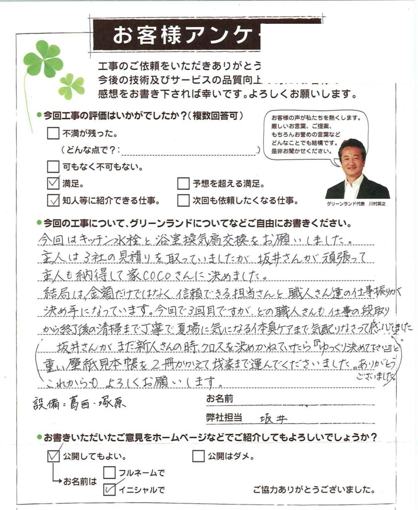 今回はキッチン水栓と浴室換気扇交換をお願いしました。 主人は3社の見積りを取っていましたが、坂井さんが頑張って主人も納得して家CoCoさんに決めました。 結局は、金額だけではなく、信頼できる担当さんと職人さん達の仕事振りが決め手になっています。今回で3回目ですが、どの職人さんも仕事の段取りから終了後の清掃まで丁寧で夏場に気になる体臭ケアまで気配りなさって感心しました。 坂井さんがまだ新人さんの時、クロスを決めかねていたら「ゆっくり決めて下さい」と重い壁紙見本帳を2冊かかえて我家まで運んでくださいました。ありがとうございました。これからもよろしくお願いします。