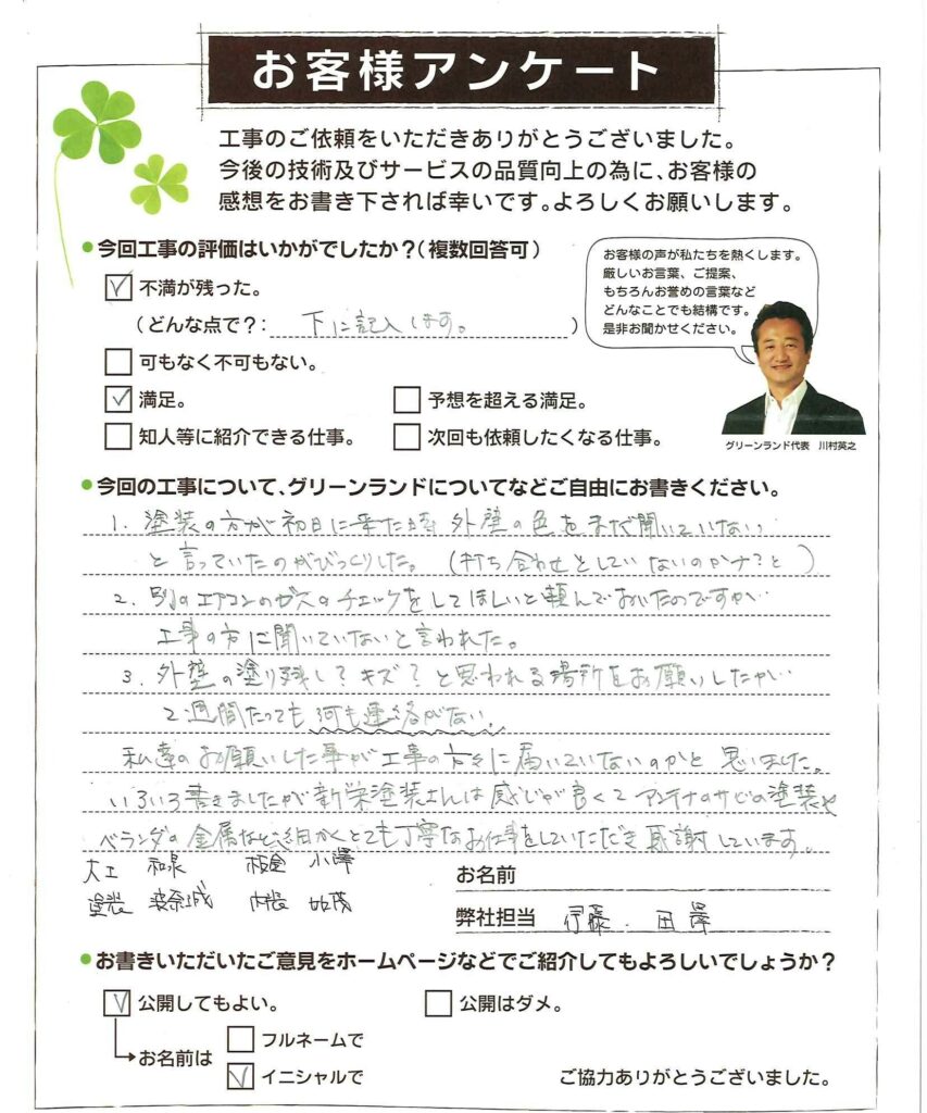 1.塗装の方が初日に来た時外壁の色をまだ聞いていないと言っていたのがびっくりした。 (打ち合わせとしていないのか?と) 2.別のエアコンのガスのチェックをしてほしいと頼んでおいたのですが工事の方に聞いていないと言われた。 3.外壁の塗り残し?キズ?と思われる場所をお願いしたが2週間たっても何も連絡がない。 私達のお願いした事が工事の方々に届いていないのかと思いました。 いろいろ書きましたが新栄塗装さんは感じが良くてアンテナのサビの塗装 ・ベランダの金属など細かくとても丁寧なお仕事をしていただき感謝しています。