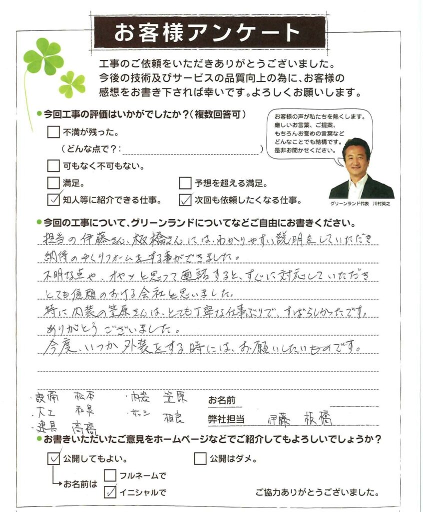 担当の伊藤さん、板橋さんには、わかりやすい説明をしていただき納得のゆくリフォームをする事ができました。 不明な点や、オヤッと思って電話すると、すぐに対応していただきとても信頼のおける会社と思いました。 特に内装の笠原さんは、とても丁寧な仕事ぶりで、すばらしかったです。ありがとうございました。 今度、いつか外装をする時には、お願いしたいものです。