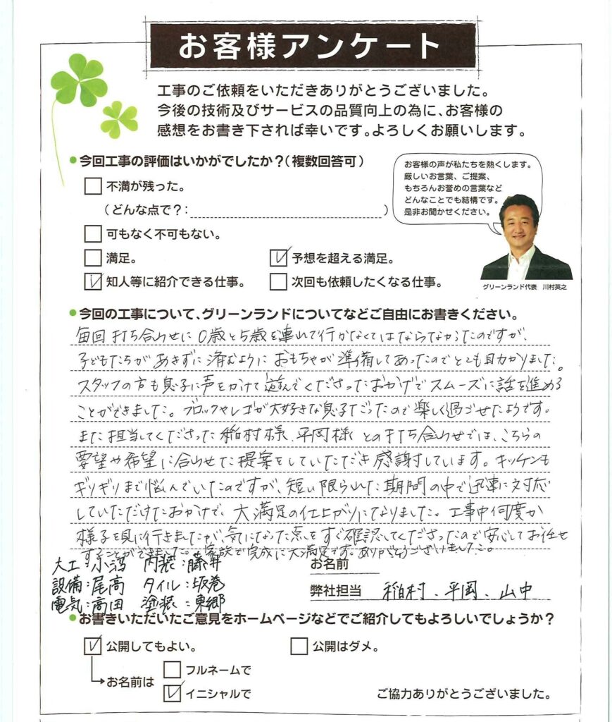 数年前からリフォームをしたいとの希望はありましたが、息子が大学進学で家を出るにあたって、本格的に考え始めました。当初はいくつかの会社から見積りをとろうと思っていたのですが、最初にメールしたグリーンランドさんからすぐに返信があり打ち合わせ日が決定され、その時の皆さんの対応がとても感じが良く、ぜひこちらでお願いしようと思い、結局他社にはメールもせずに終わりました。リフォームしてあたっては「ほとんど使用してしない和室を収納部屋に」「フローリングと明るい色に」ぐらいしか具体的な払いにな人、ほとんどデザインは小野塚さんに考えていただきました。私があまり悩まないように、いくつかの選択を提示していただき、とても、ありがたかったです。担当の方がみなさん親切で、説明も分かりやすく、安心してお任せできました。 仕上がりにも大変満足しています。この度はプランニングではなさん、すてきなデザインを提案してくださった小野塚さん、計画通り施工して下さった田澤さん、本当にありがとうございました。