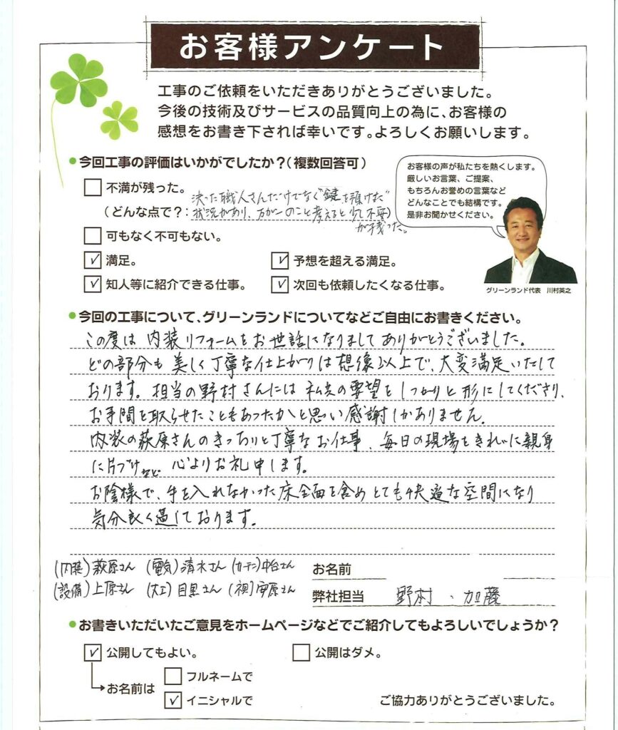 この度は内装リフォームをお世話になりましてありがとうございました。 どの部分も美しく丁寧な仕上がりは想像以上で、大変満足いたしております。担当の野村さんには私共の要望をしっかりと形にしてくださり、 お手間を取らせたこともあったかと思い感謝しかありません。 内装の萩原さんのきっちりと丁寧なお仕事、毎日の現場をきれいに親身に片づけなど心よりお礼申します。 お陰様で、手を入れなかった床全面を含めとても快適な空間になり気分良く過しております。