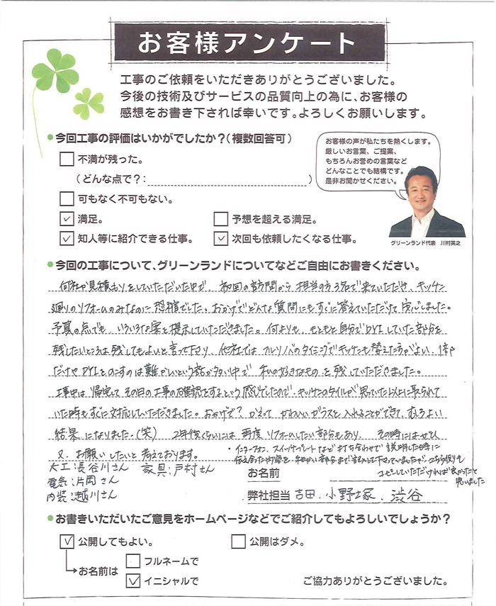 御社には20年程前にもお世話になりました。この度、営業の丸山様に初めてお目にかかった時の好印象はリフォーム完了のその日まで、一つも変わることはございませんでした。私共の難しく面倒なリクエストを一つずつ丁寧に確実に取り上げお休みの日でもメールにご対応下さり、どんな時でも真摯に取り組んで下さいました。終始礼儀正しく誠実で笑顔いっぱいの様子に家族一同、丸山様のファンになりました。現場監督の沼野様の要所要所を押さえつつ行程ごとの後始末まで、手抜きのない仕事ぶりでしたし、壁紙の小柴様の大変に丁寧で見事な仕上がりの匠な仕事ぶり、電気の片岡様のお人柄、手際良い技術、その他みな様本物のプロの確かな技術を見せてくださいました。そして何よりどんな暑い中でもいつも笑顔で仕事して下さり、リフォーム中の不自由さを忘れる程気持ち良く毎日を過ごすことができました。今後もまたお世話になりたいと思います。もちろん知人にも是非推薦させて頂きたいと存じます。