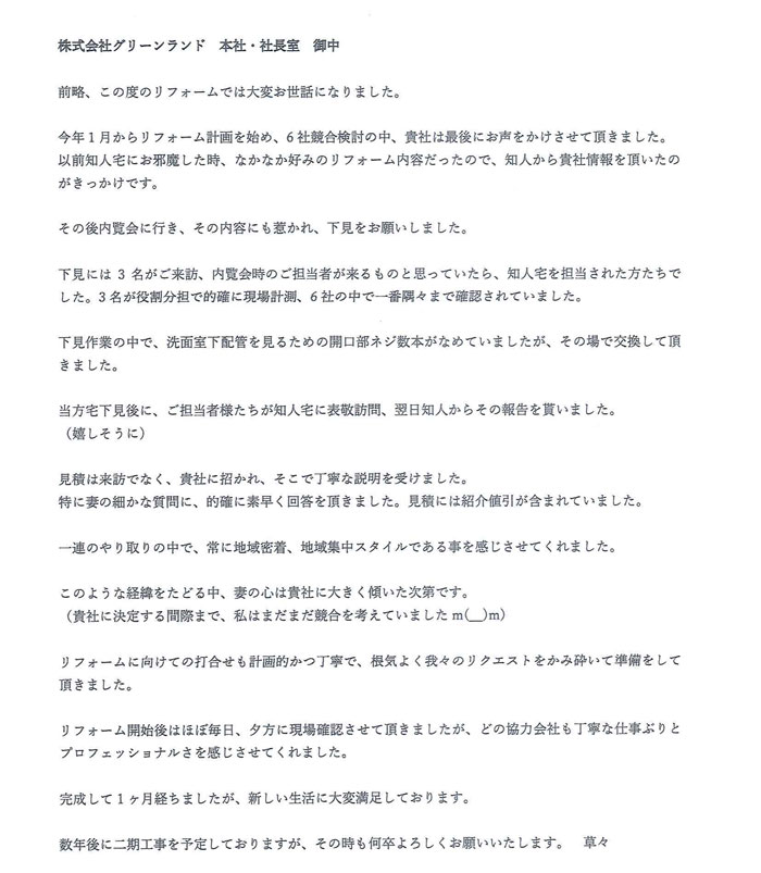 今回、初めてリフォームしました。当初、数社で、①体制(対応力)、②説明/提案力、③コ スト(御社、Bタス、Fハウス、H 島建設、S建、H谷エリフォーム)、の観点で、選定を 実施、具体的には、6社に、当社に最適なリフォーム案を提示してもらい、最適案(A)を 選定、その後、最適案(A) をもとに6社に見積もりを依頼、①②③の観点で御社を選定し た次第。特に①②については、店長の誠実な対応、及び優秀な女性プランナーによる女性の 視点を取り入れた上での、しっかり時間をかけた提案力(本当に時間をかけて考えてくださ ったことが伝わる内容でした)が決め手となり、今回、お願いすることにしました。③は、 総費用が高いから除外・・という考え方はしておらず、中身が重要と考え、主にスクリーニ ングに使用、具体的には、どんぶり勘定になり易く、グレーゾーンであるその他費用(解体 等工事費、諸経費が多いなど違和感のある社は除外)に着目し、費用捻出姿勢から、顧客に 対する誠実性を判断するために使用したイメージ。私の職業柄(運用投資業)、中身を分析 し、複数社引き合いをしないと納得できないため、2年かけて、御社を選定させていただいた次第。選定前の当初、御社のマイナス点は、他社比、工期が長いこと、仮住まいを強く勧 めること(他社は2週間くらいで、かつ住みながらで全然できますよ!という感じ)、でしたが、終わってみて、むしろ、感謝した次第(工事中の粉塵が尋常でなく、とても住みながらは難しかったことが実際、始まってから理解でき、御社は、マイナス評価を恐れず、顧客目線の提案だったと感心させられました)。リフォーム中、また、その後のアフターフォロー(補修等)も満足しており、知人に自信をもって、推奨できると共に、またお願いした いと考えています(今後は引き合いなし)。まだまだ、記載し足りませんが、感想は以上で す。この度は、素敵(感動的)なリフォーム、家族一同、心から、御礼申し上げます。