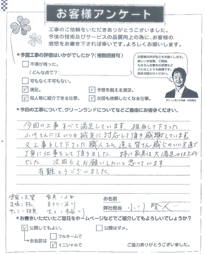 今回の工事すべて満足しています。担当して下さった小川さんにはいつも誠実に対応して頂き感謝しています。又工事をして下さった職人さん達も皆さん感じのいい方達で丁寧に仕事をして頂きました。特に家具は大満足の仕上がりでした。次回もお願いしたいと思っています。有難うございました。