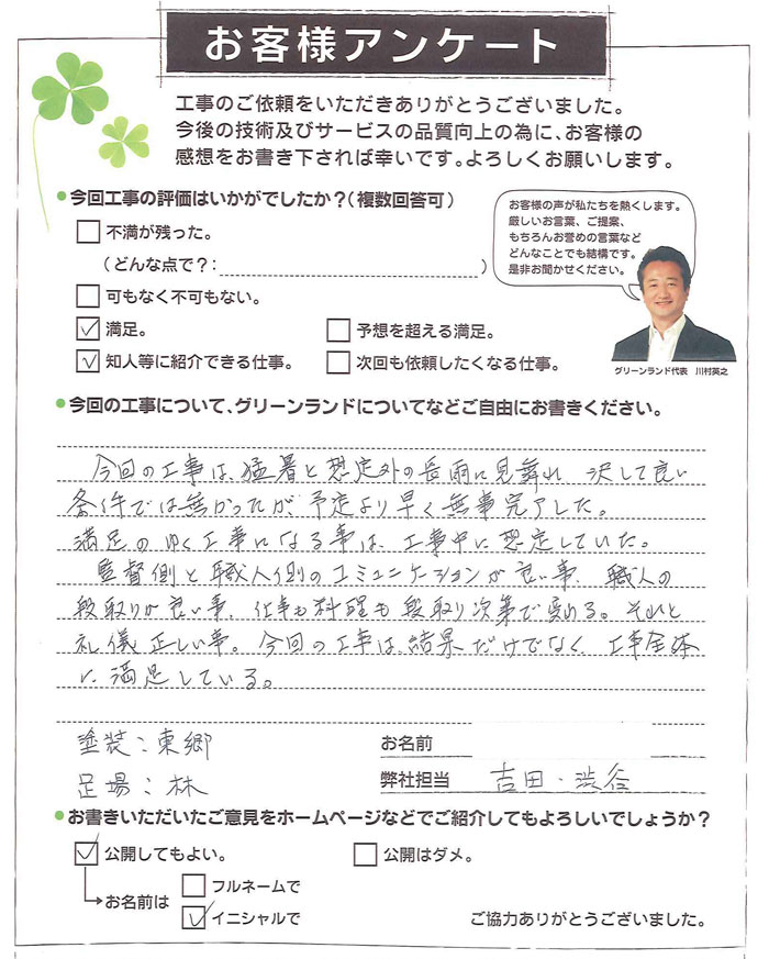 2年前に息子夫婦の住宅を新築して頂いた時のグリーンランドさんの対応、仕事ぶりに感激し、新築の出来栄えも申し分なかった事から、今回親世帯のプチリフォームについてはグリーンランドさん一択でお願いしました。スタッフの皆様、職人の皆様の対応ぶり、仕事ぶりは正に期待通りで非常に丁寧に仕上げて頂きました。今後も親世帯、子世帯ともどもお世話になりたいとおもっております。