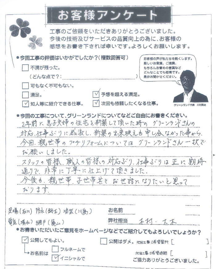 2年前に息子夫婦の住宅を新築して頂いた時のグリーンランドさんの対応、仕事ぶりに感激し、新築の出来栄えも申し分なかった事から、今回親世帯のプチリフォームについてはグリーンランドさん一択でお願いしました。スタッフの皆様、職人の皆様の対応ぶり、仕事ぶりは正に期待通りで非常に丁寧に仕上げて頂きました。今後も親世帯、子世帯ともどもお世話になりたいとおもっております。