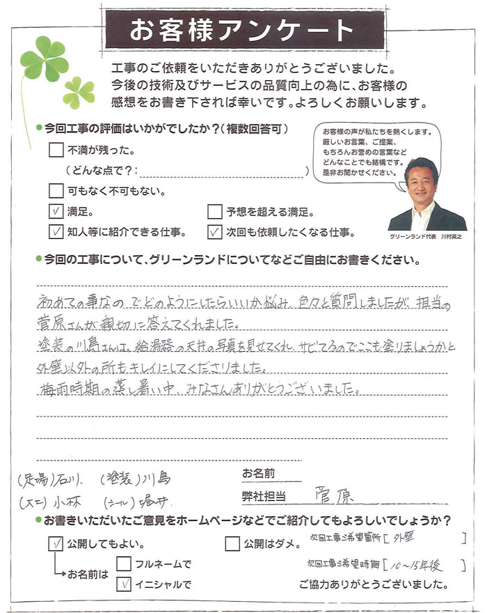 初めてのことなのでどのようにしたらいいか悩み、いろいろと質問しましたが、担当の菅原さんが親切に答えてくれました。塗装の川島さんは給湯器の天井の写真を見せてくれ、サビてるのでここも塗りましょうかと外壁以外の所もキレイにしてくださりました。梅雨時期の蒸し暑い中、みなさんありがとうございました。