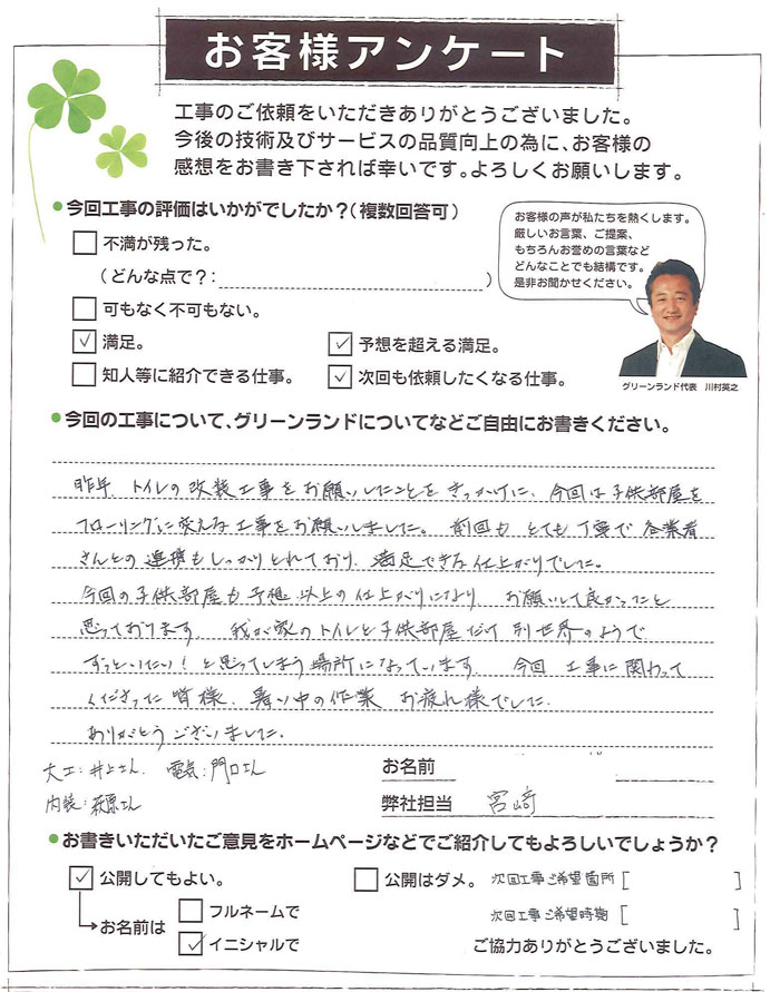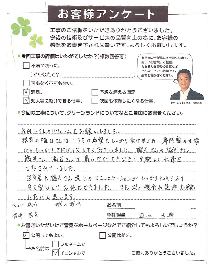 今回トイレのリフォームをお願いしました。担当の樋口さんはこちらの希望をしっかり受け止め、専門家の立場からしっかりアドバイスしてくださいました。職人さんの越川さん、藤井さん、國吉さんは暑いなかテキパキと手際よく仕事をこなされていました。担当者と職人さん達とのコミュニケーションがしっかりととれており全て安心してお任せできました。また次の機会も是非お願いしたいと思います。