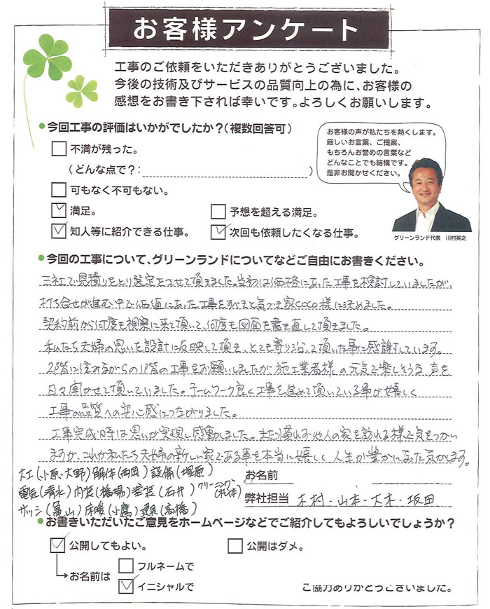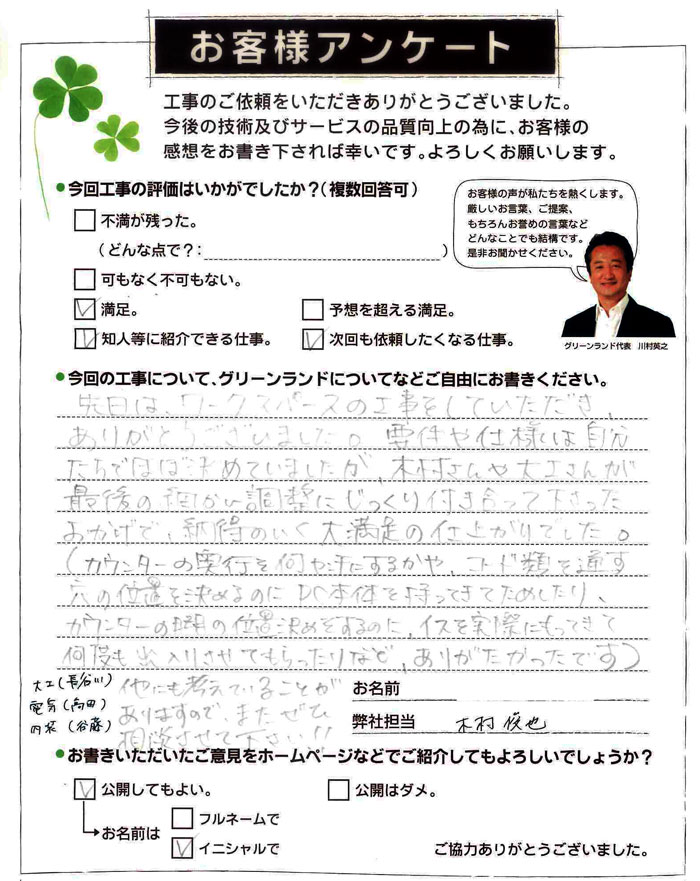 今回の工事すべて満足しています。担当して下さった小川さんにはいつも誠実に対応して頂き感謝しています。又工事をして下さった職人さん達も皆さん感じのいい方達で丁寧に仕事をして頂きました。特に家具は大満足の仕上がりでした。次回もお願いしたいと思っています。有難うございました。