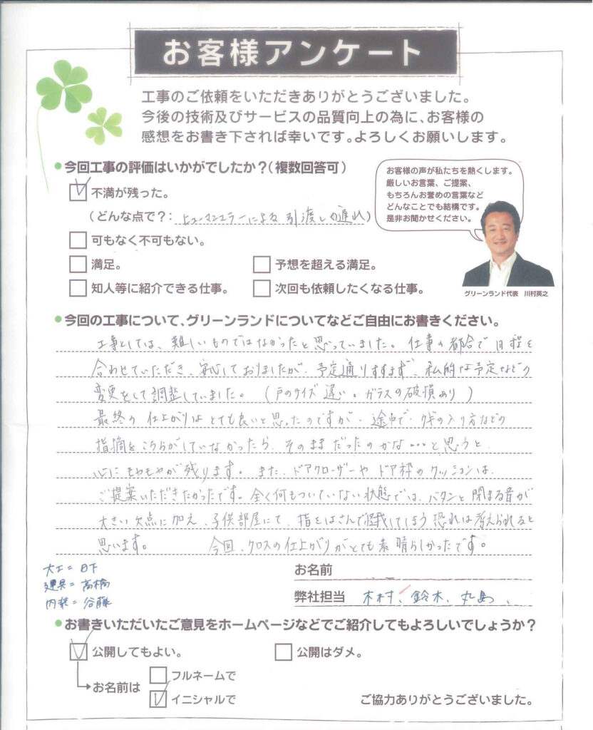 工事としては難しいものではなかったと思っていました。仕事の都合で日程を合わせていただき、安心しておりましたが、予定通り進まず、私的な予定などの変更をして調整していました。(戸のサイズ違い・ガラスの破損あり)最後の仕上がりはとても良いと思ったのですが、途中でクギの入り方などの指摘をこちらがしていなかったら、そのままだったのかな…と思うと心にモヤモヤが残ります。また、ドアクローザーやドア材のクッションはご提案いただきたかったです。全く何もついていない状態では、バタンと閉まる音が大きい欠点に加え、子供部屋にて、指をはさんで怪我してしまう恐れは考えられると思います。今回クロスの仕上がりがとても素晴らしかったです。