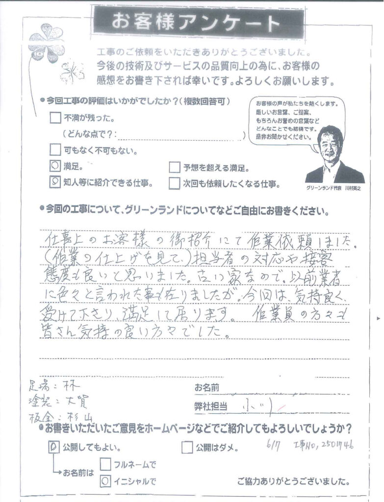 仕事上のお客様のご紹介にて作業依頼しました。(作業の仕上げを見て)担当者の対応や接客態度も良いと思いました。古い家なので、以前業者に色々と言われた事も在りましたが、今回は、気持ち良く受けて下さり満足して居ります。作業員の方々も皆さん気持ちの良い方々でした。