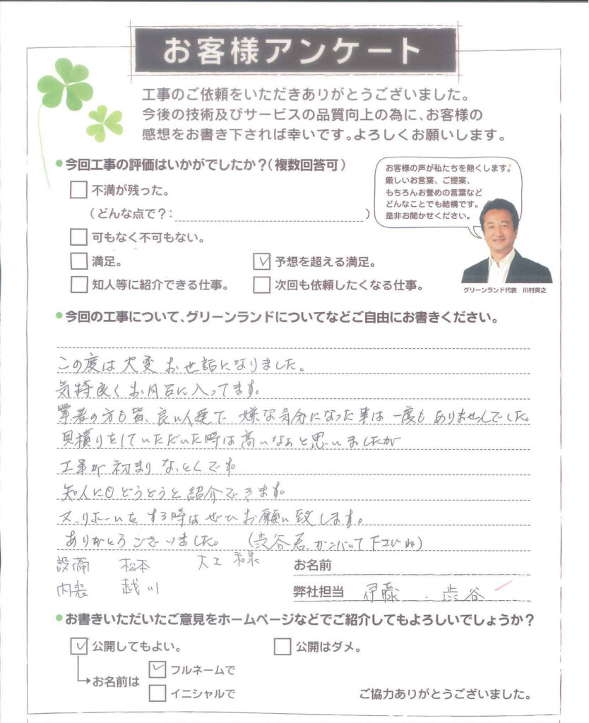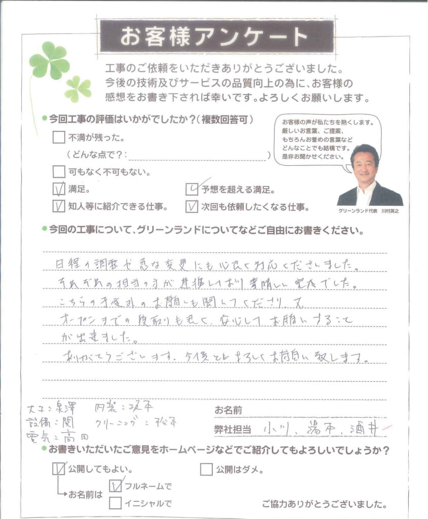 この度は大変お世話になりました。気持ち良くお風呂に入ってます。業者の方も皆、良い人達で、嫌な気分になったことは一度もありませんでした。見積りをしていただいた時は高いなあと思いましたが工事がはじまりなっとくです。知人にもどうどうと紹介できます。又、リフォームする時はぜひお願い致します。ありがとうございました。(渋谷君、ガンバって下さいね)