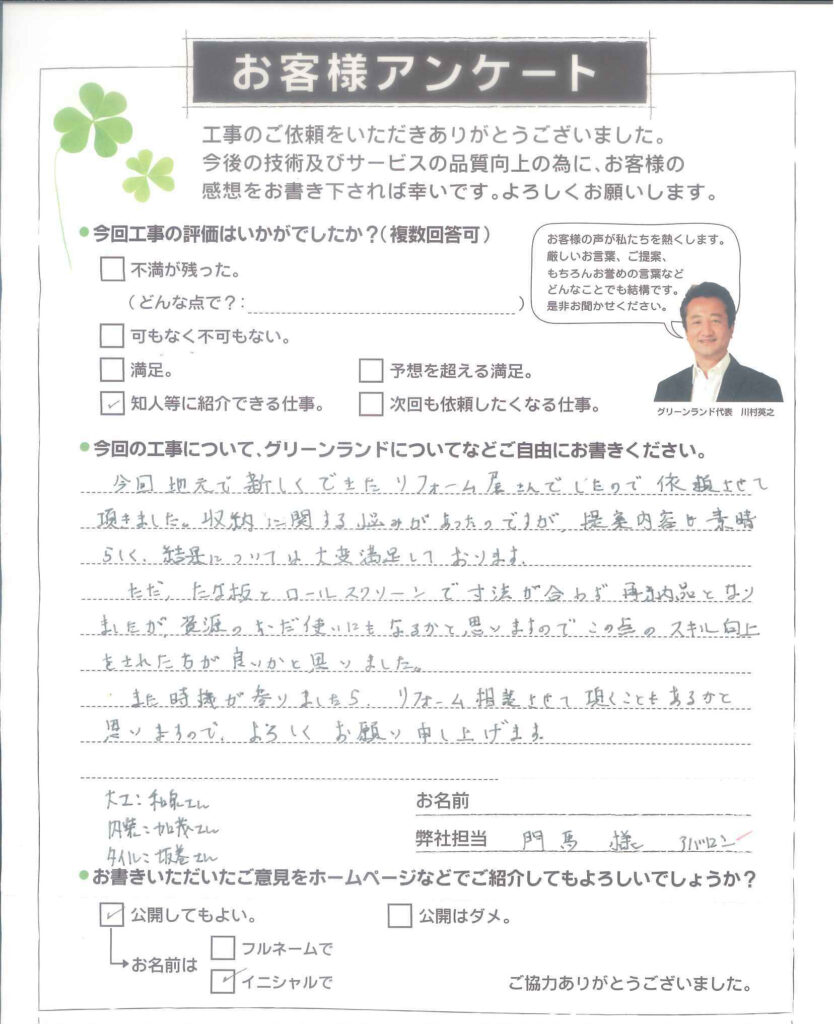 今回地元で新しくできたリフォーム屋さんでしたので依頼させて頂きました。収納に関する悩みがあったのですが、提案内容が素晴らしく、結果については大変満足しております。ただ、たな板とロールスクリーンで寸法が合わず再納品となりましたが資材のむだ使いにもなるかと思いますのでこの点のスキル向上をされた方が良いかと思いました。また時機が参りましたら、リフォーム相談させて頂くこともあるかと思いますので、よろしくお願い申し上げます。