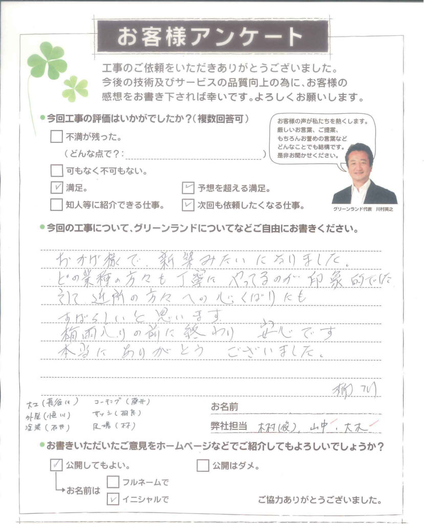 おかげ様で、新築みたいになりました。どの業者の方々も丁寧にやってるのが印象的でした。そして近所の方々への心配りにもすばらしいと思います。梅雨入りの前に終わり安心です。本当にありがとうございました。