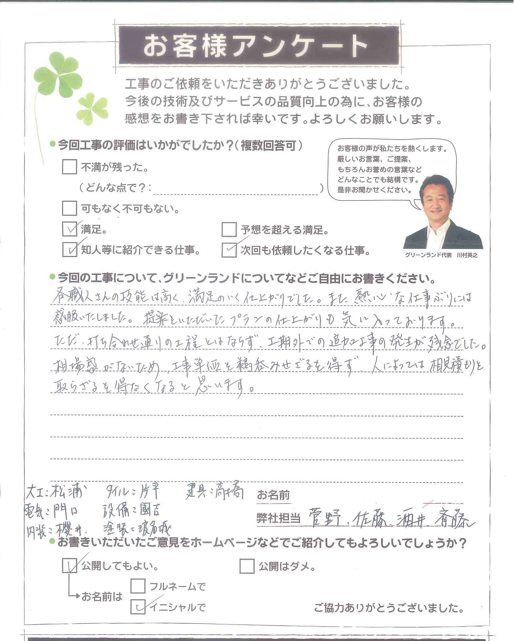 浴室のリフォームと脱衣所の壁紙交換を依頼しました。何度もお世話になっていたので安心してお任せできました。5日間の工事期間でしたが職人の対応もよく、仕事も丁寧に仕上げて下さり、大満足です。築25年のわが家なので、又何かの時にはお願い致します。お世話になりました。営業の伊藤さん、現場の小松さん、ありがとうございました。
