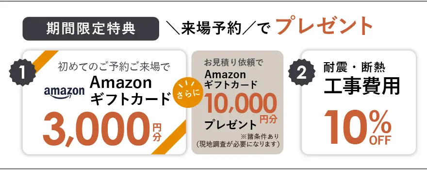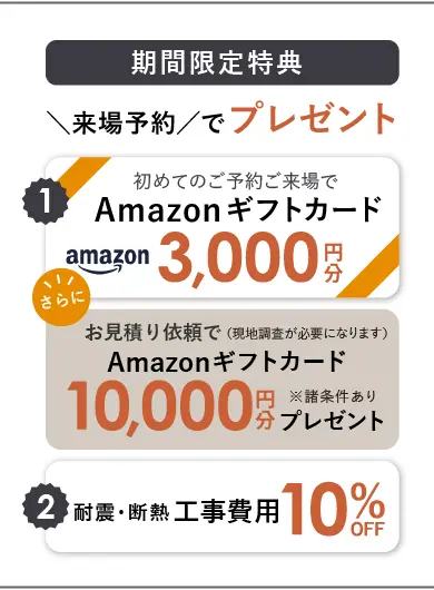 ※お見積り依頼のAmazonギフトカード10,000円分プレゼントは、全面改装やLDK改装、間取り変更などの工事規模が対象です(詳細はご来場時にご確認ください)