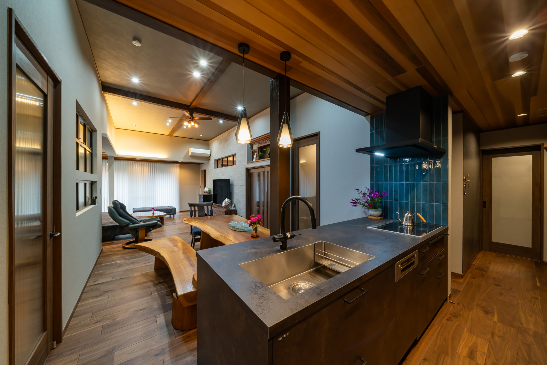 ・オープンキッチンと大型キッチンバックセットには GRAFTEKTを採用。パントリーとつなげ、使い勝手の良さとデザイン性を両立しました。