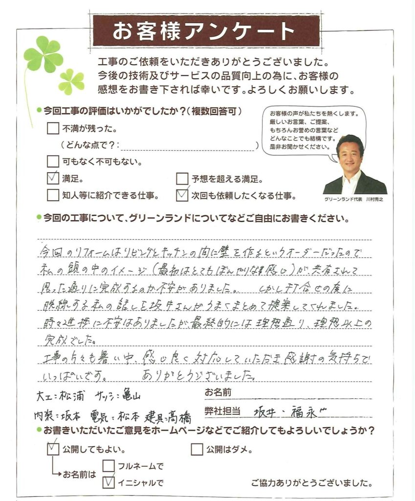 今回のリフォームはリビングとキッチンの間に壁を作るというオーダーだったので 私の頭の中のイメージ(最初はとてもぼんやりな感じ)が共有されて、思った通りに完成するのか不安がありました。しかし打合せの度に脱線する私の話を坂井さんがうまくまとめて提案してくれました。 時々進捗に不安はありましたが、最終的には理想通り、理想以上の完成でした。 工事の方々も暑い中、感じ良く対応していただき感謝の気持ちでいっぱいです。ありがとうございました。