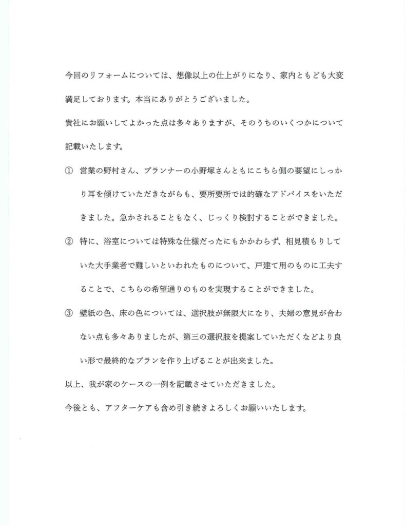 今回のリフォームについては、想像以上の仕上がりになり、家内ともども大変満足しております。本当にありがとうございました。 貴社にお願いしてよかった点は多々ありますが、そのうちのいくつかについて記載いたします。 ① 営業の野村さん、プランナーの小野塚さんともにこちら側の要望にしっかり耳を傾けていただきながらも、要所要所では的確なアドバイスをいただきました。急かされることもなく、じっくり検討することができました。 ②特に、浴室については特殊な仕様だったにもかかわらず、相見積もりしていた大手業者で難しいといわれたものについて、戸建て用のものに工夫することで、こちらの希望通りのものを実現することができました。 ③ 壁紙の色、床の色については、選択肢が無限大になり、夫婦の意見が合わない点も多々ありましたが、第三の選択肢を提案していただくなどより良い形で最終的なプランを作り上げることが出来ました。 以上、我が家のケースの一例を記載させていただきました。 今後とも、アフターケアも含め引き続きよろしくお願いいたします。