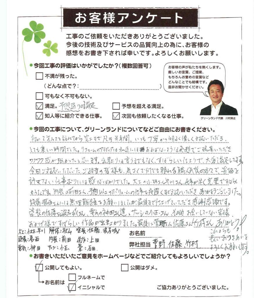 初めてオフィスを訪れてから完工までおよそ半年間、いつも丁寧かつ明るく優しく対応いただき、 とても楽しい時間でした。リフォームのアイディアは私達にはおばないような発想でご提案いただきワクワク感が強かったと思います。出来上がりは言うまでもなく、すばらしい仕上がりで、大変満足してます。 今回ご対応いただいた、ご担当の皆様も、気さくで何でも頼れる職人気質の方々で、妥協を許さない仕事ぶりには感心ばかりでした。大工の小林さん早川さん、仕事が早く完璧ですばらしかったです。内装の前田さん、予想以上のボリュームの仕事で夜遅くまで対応いただきありがとうございました。 設備の葛西さんには無理難題をお願いしましたが、最後まで仕上げていてだき感謝感激です。 塗装の佐藤さん波名城さん、電気の神田さん達、サッシの小玉さん、その他お会いしていない皆様おかげさまですばらしい作品が出来上がりました。最後に営跡さん佐藤さん竹村さん、ありがとう!これからも長いおつきあいをよろしくお願いします。