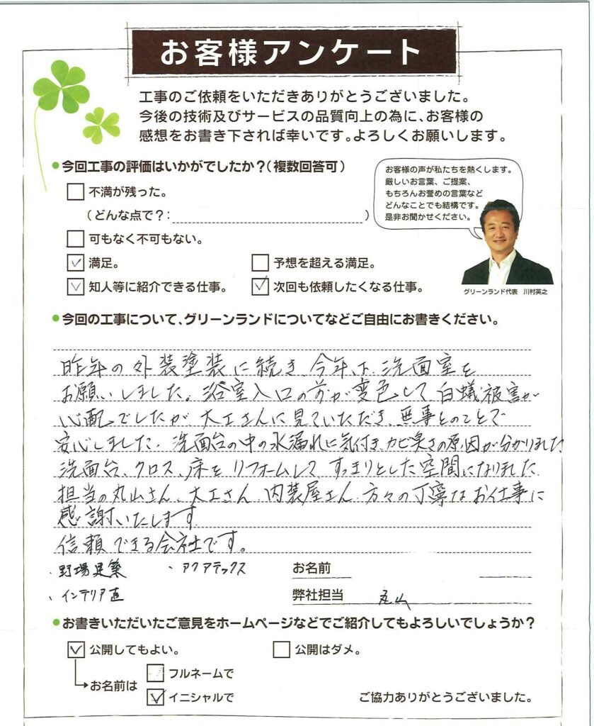 昨年の外装塗装に続き今年、下、洗面室を心配でしたが大工さんに見ていただき、無事とのことで ・お願いしました、浴室入口の方が変色して、白蟻被害も安心しました、洗面台の中の水漏れに気付き、カビ臭さの原因が分かりました洗面台、クロス、床をリフォームしてすっきりとした空間になりました。 担当の丸山さん、大工さん、内装屋さん、方々の丁寧なお仕事に感謝いたします。 信頼できる会社です。