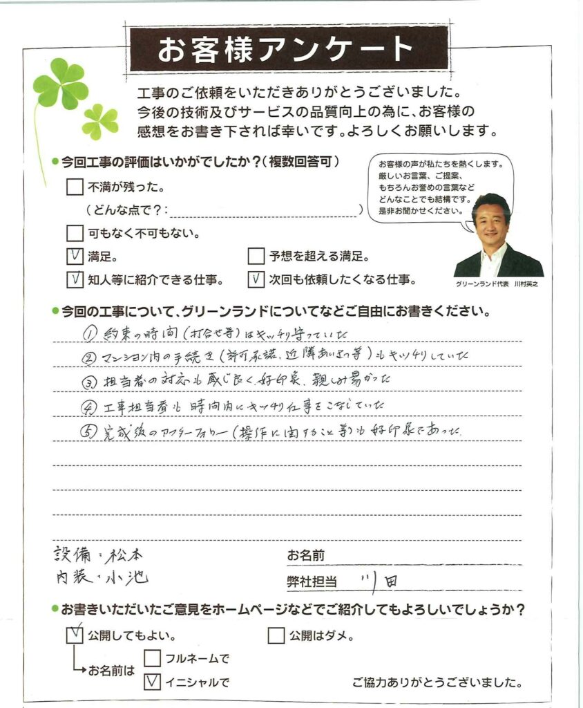 ①約束の時間(打合せ等)はキッチリ守っていた ②マンション内の手続き(許可承諾、近隣あいさつ等)もキッチリしていた ③担当者の対応も感じ良く、好印象、親しみ易かった ④工事担当者も時間内にキッチリ仕事をこなしていた ⑤完成後のアフターフォロー(操作に関すること等)も好印象であった。